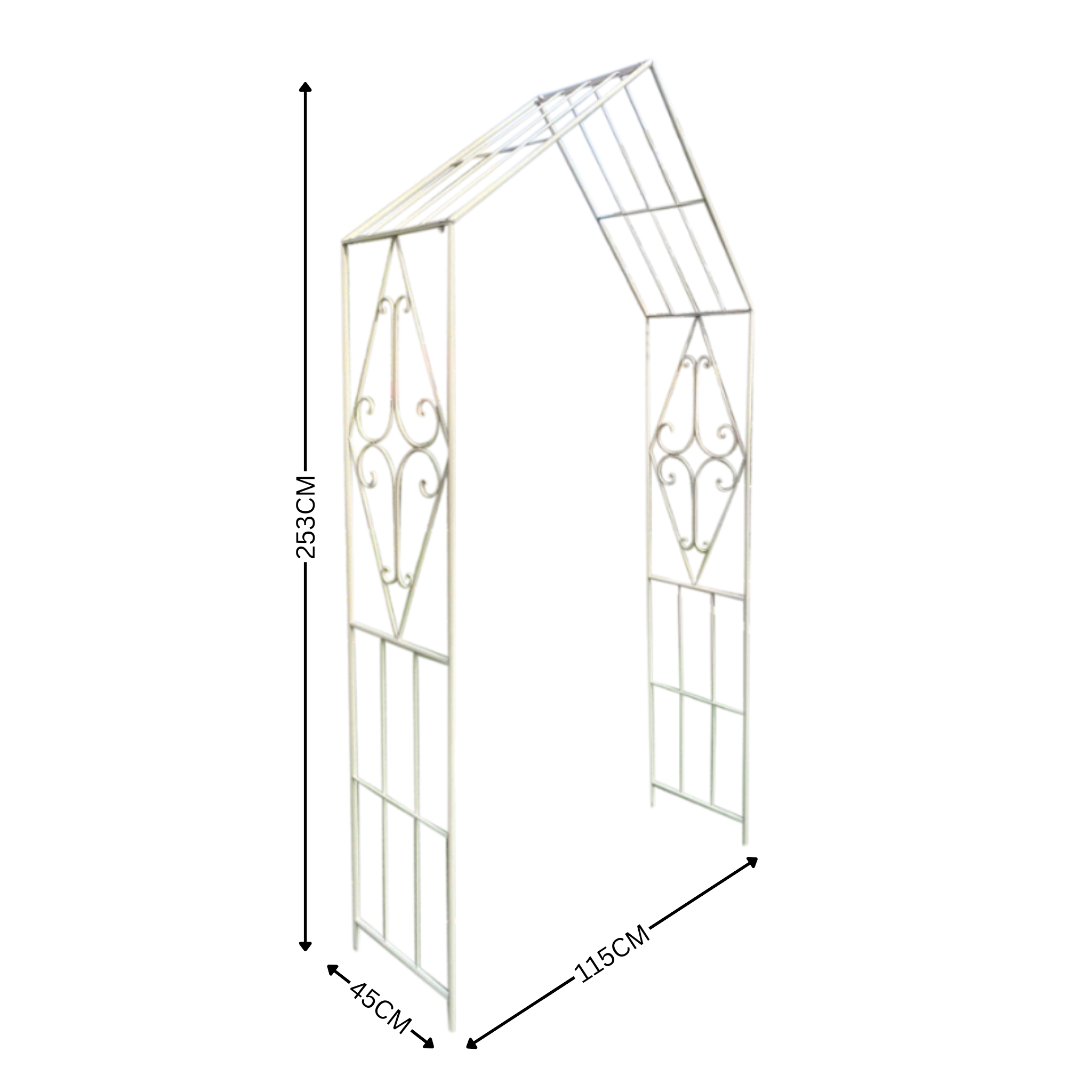 Metal garden arch.  A beautiful wedding arch or even simply a plant trellis. This beautiful steeple look arch is a much loved addition to any garden.  Take time to smell the climbing rose you have planted on its side with its lush blooms dripping down, or a deciduous climber with  Autumn colour. Use this arch to transport you from one space to another, gracefully and beautifully.