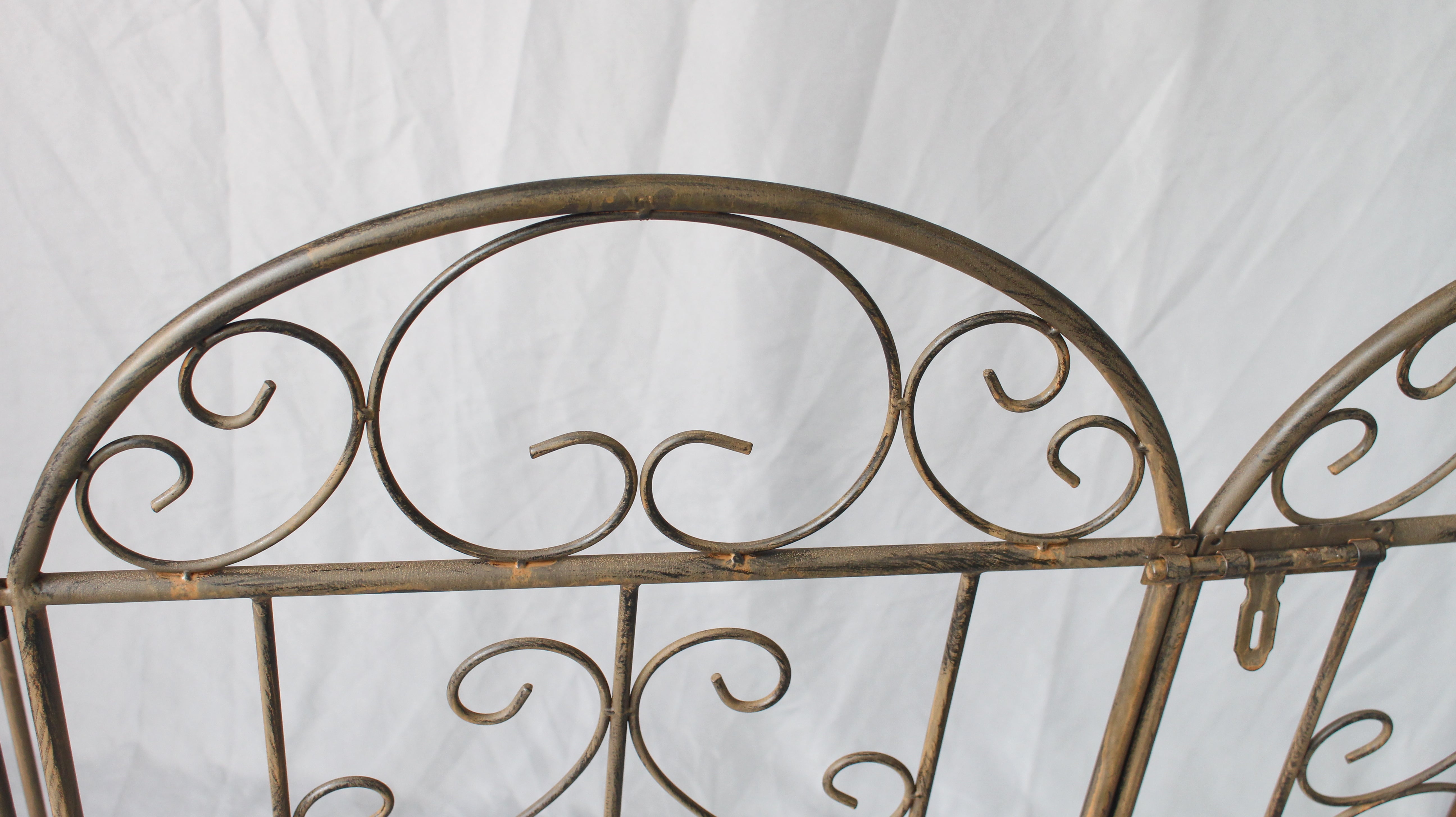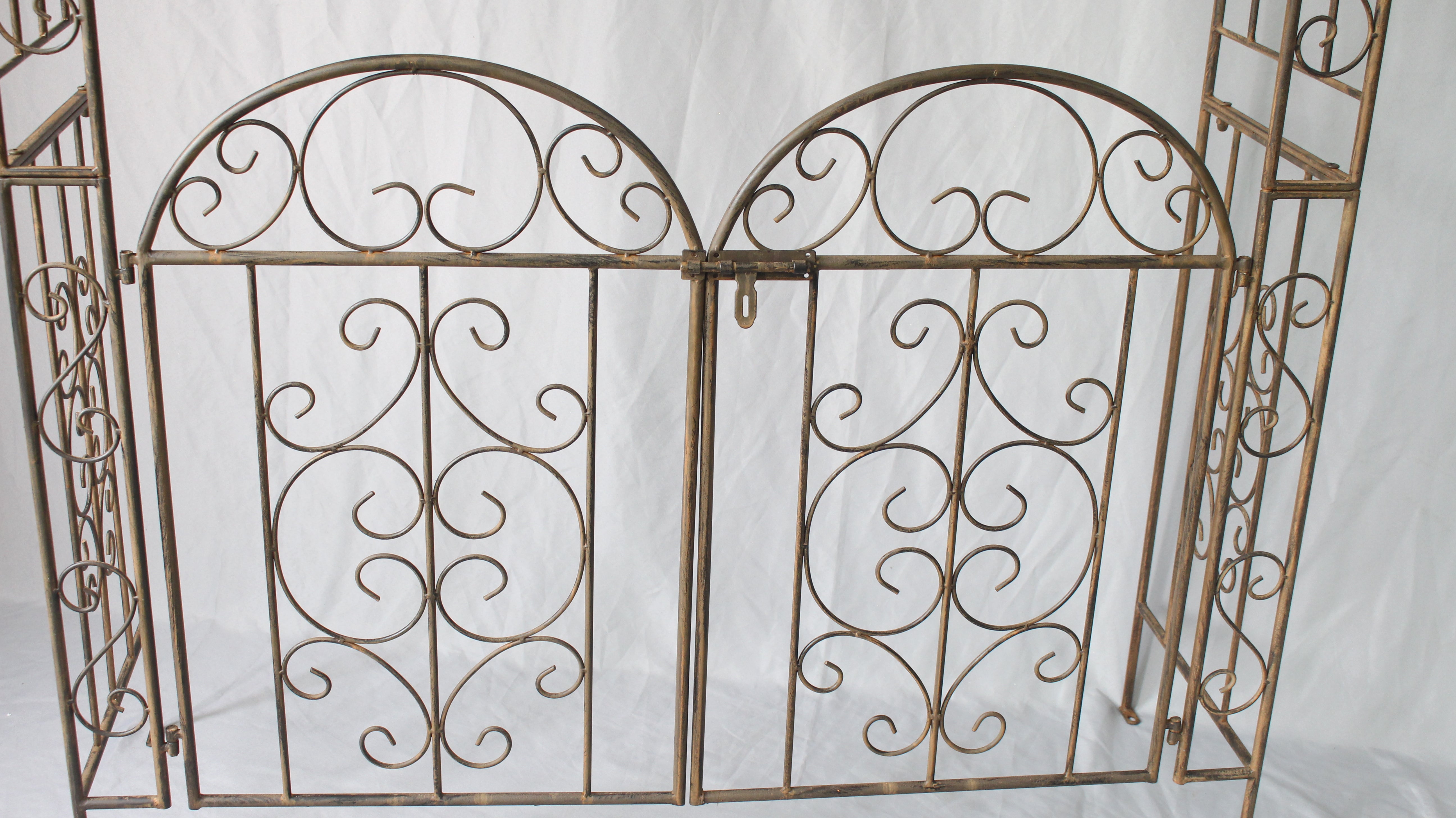Metal arch with gate, Metal gazebo with seats, Arch with seats.