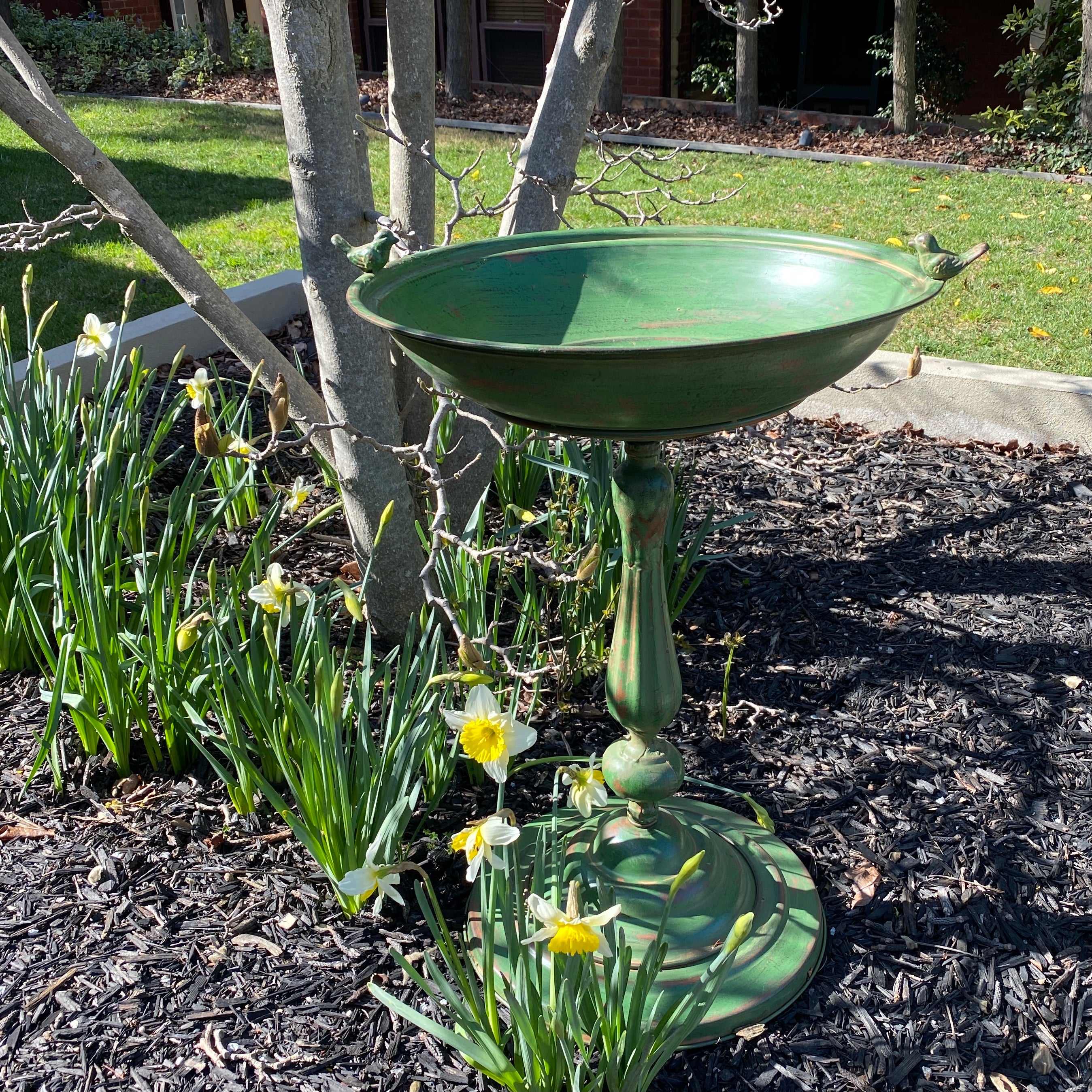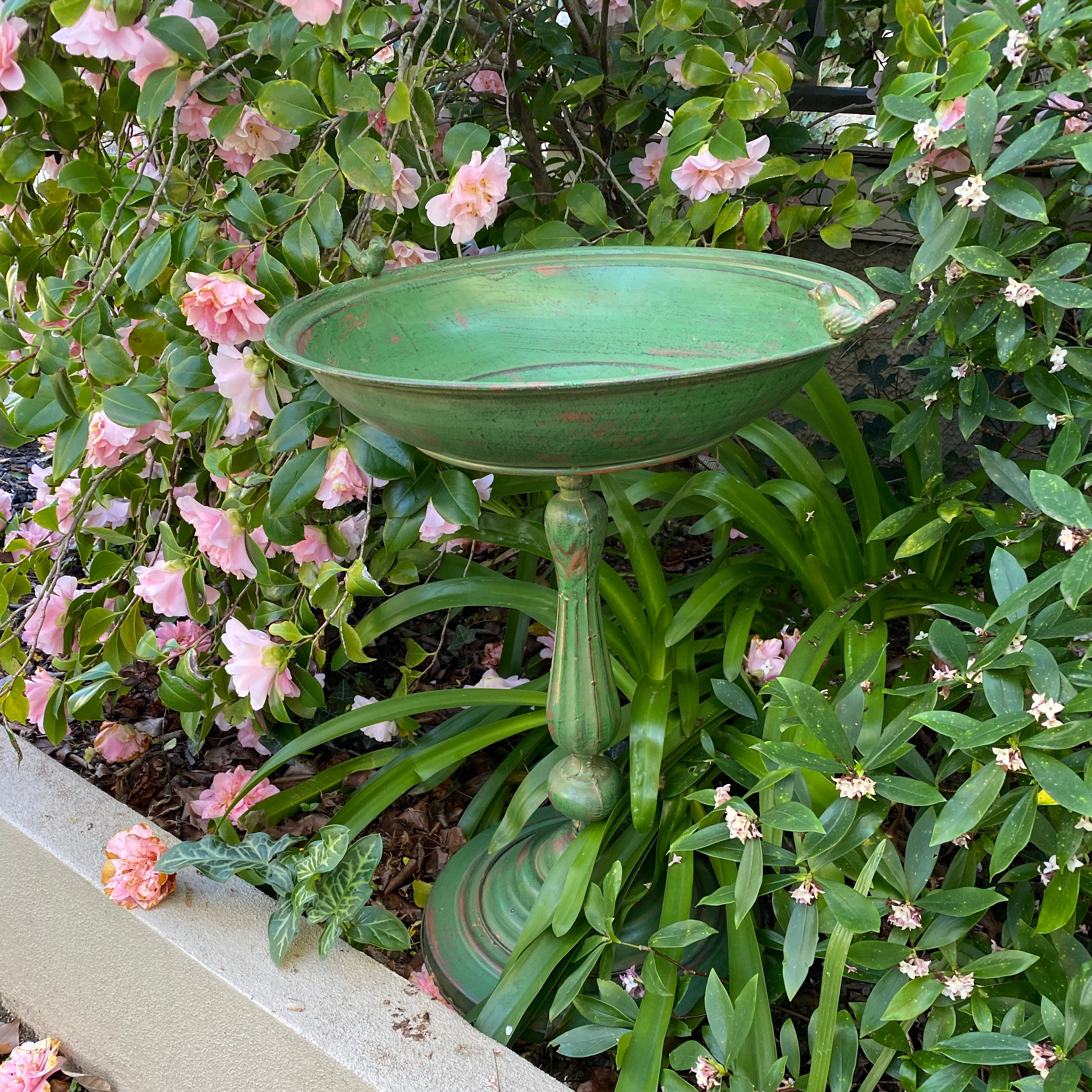 This Extra Large Rustic Antique Green metal bird feeder with little bird sculptures is a great size bird feeder or bird bath for your larger feathered friends.  Add several large stones to the basin to create a shallower area where smaller birds can access the water. Sit back, relax and discover who visits you.