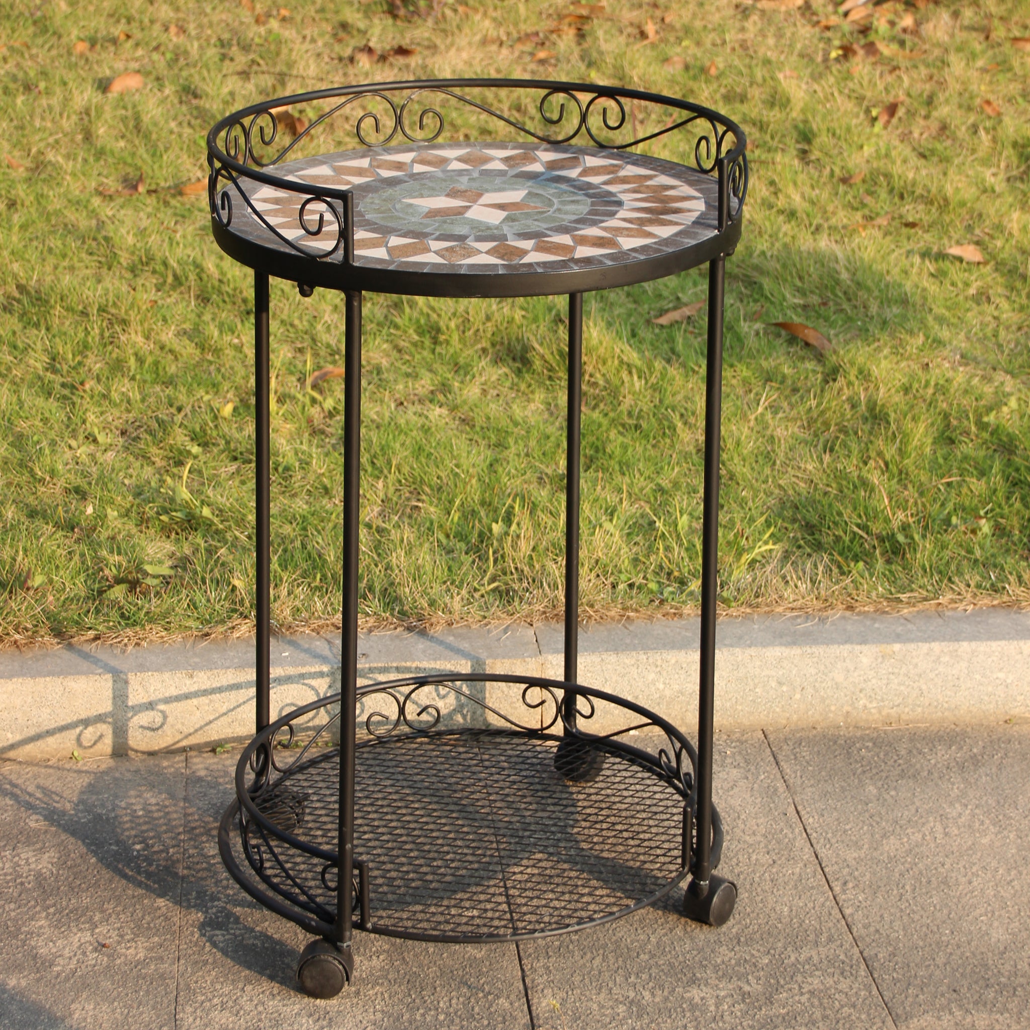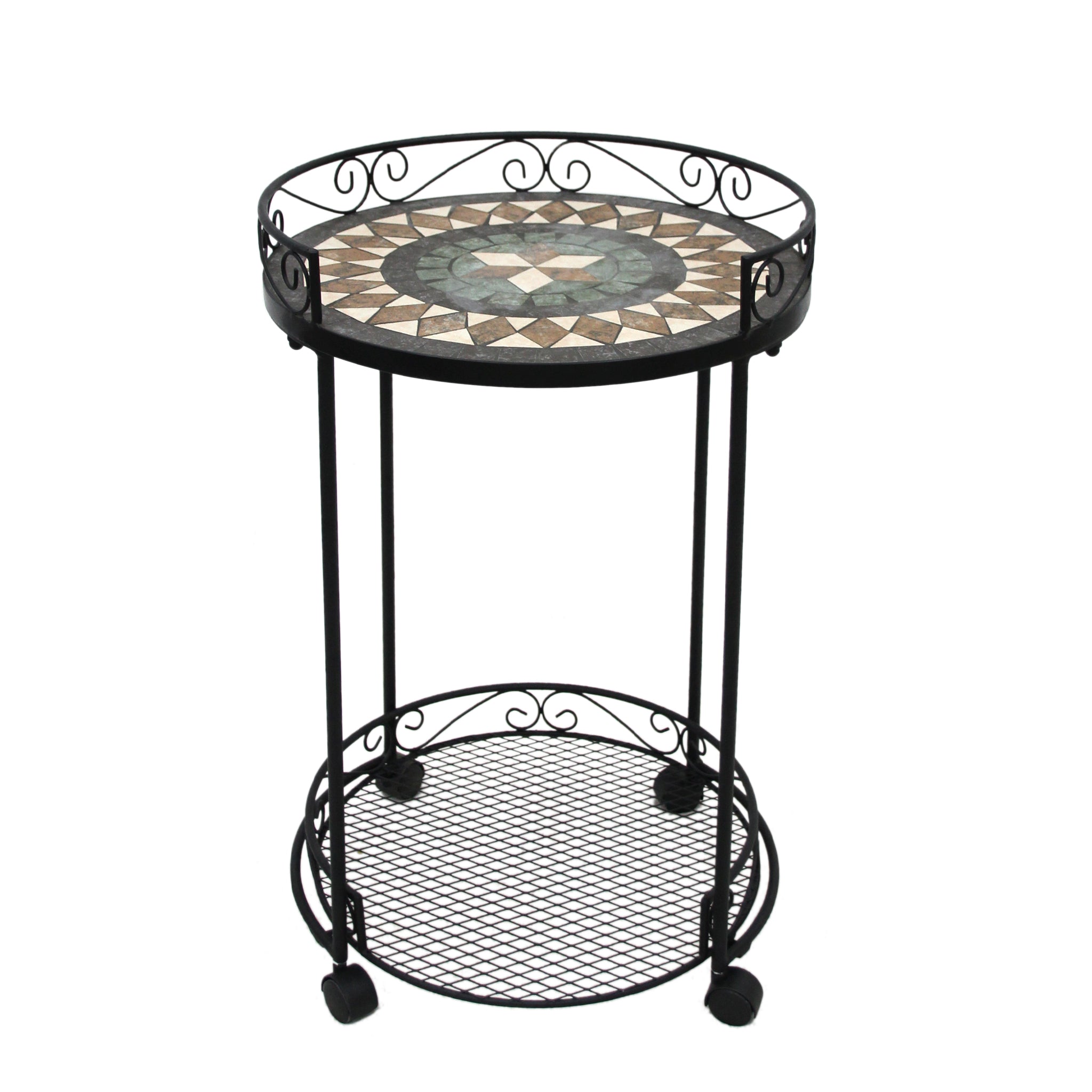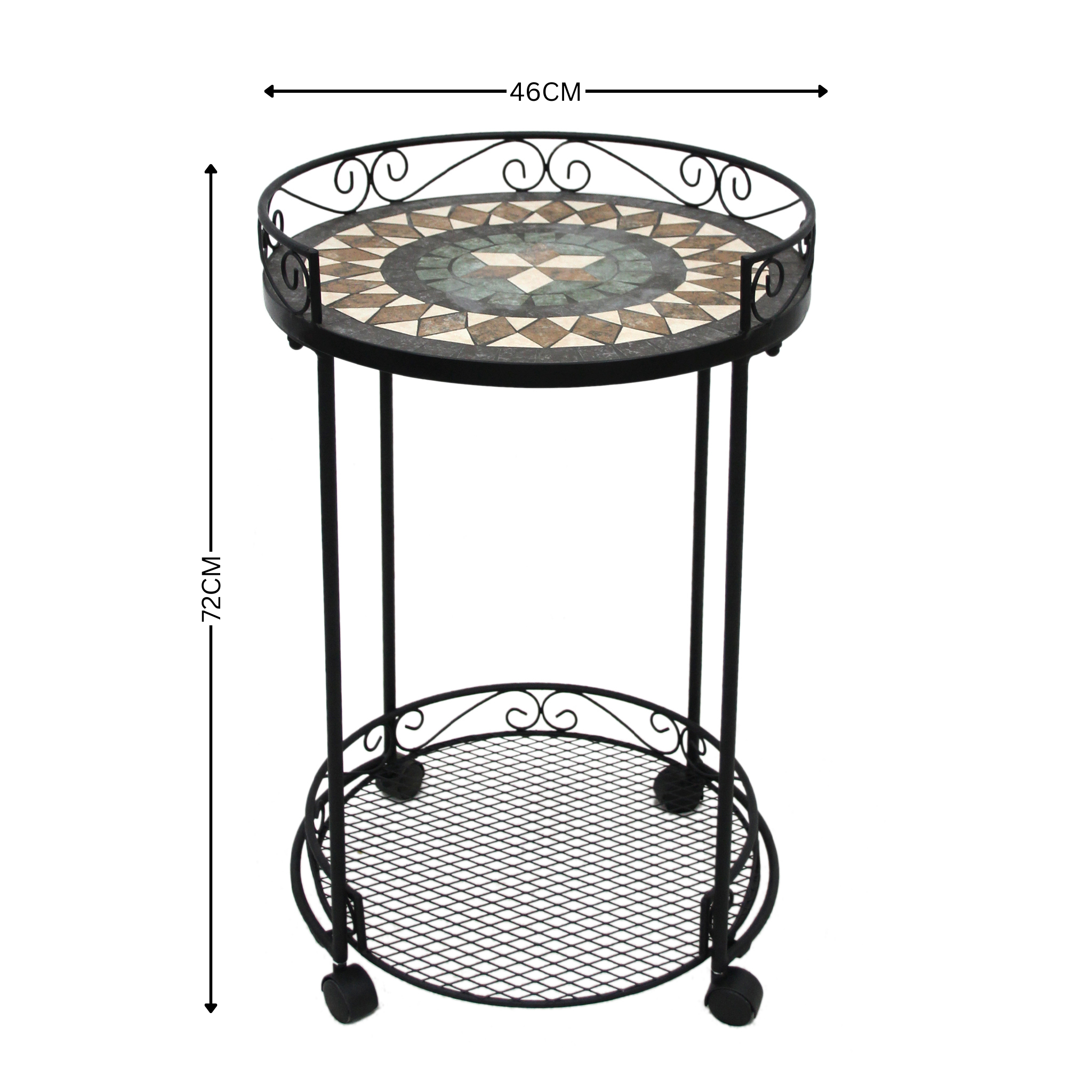 Perfect for indoor / outdoor entertainment. Trolley with wheels; Mosaic top shelf and metal lower shelf.
