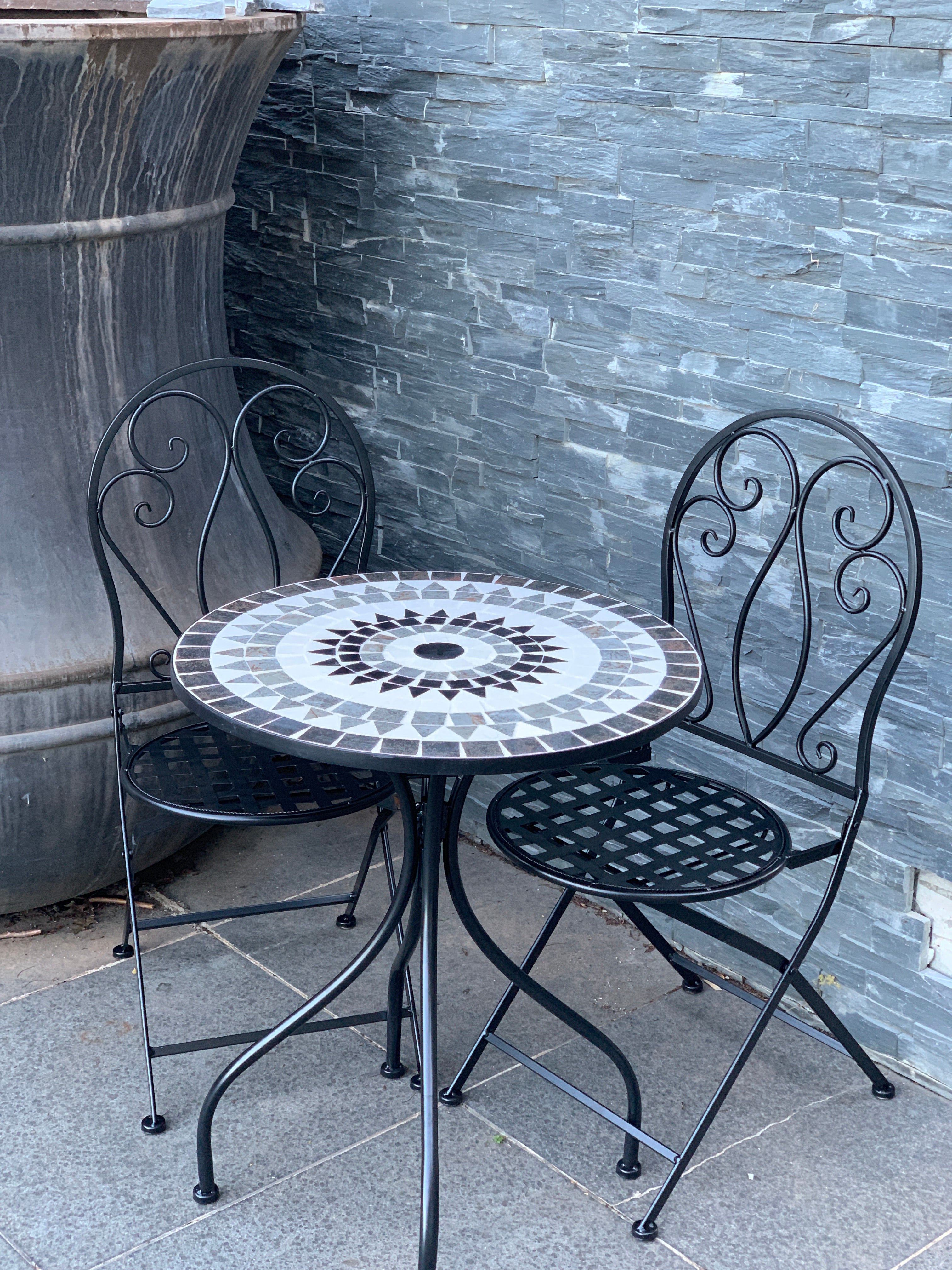 Mosaic 3 pce setting, Do you love the age old skill of mosaic, then this one is for you. This beautiful mosaic setting looks great anywhere, in your garden, on your balcony, on your deck or outdoor room.