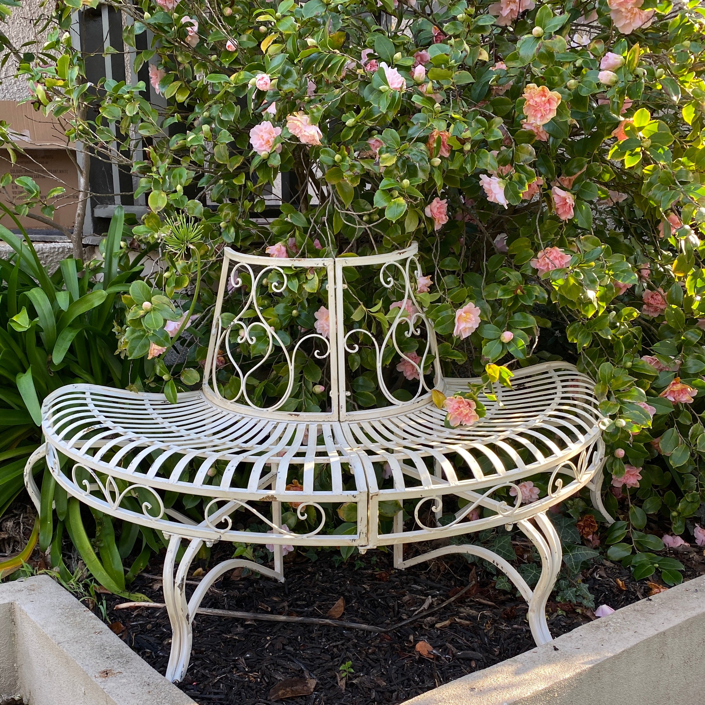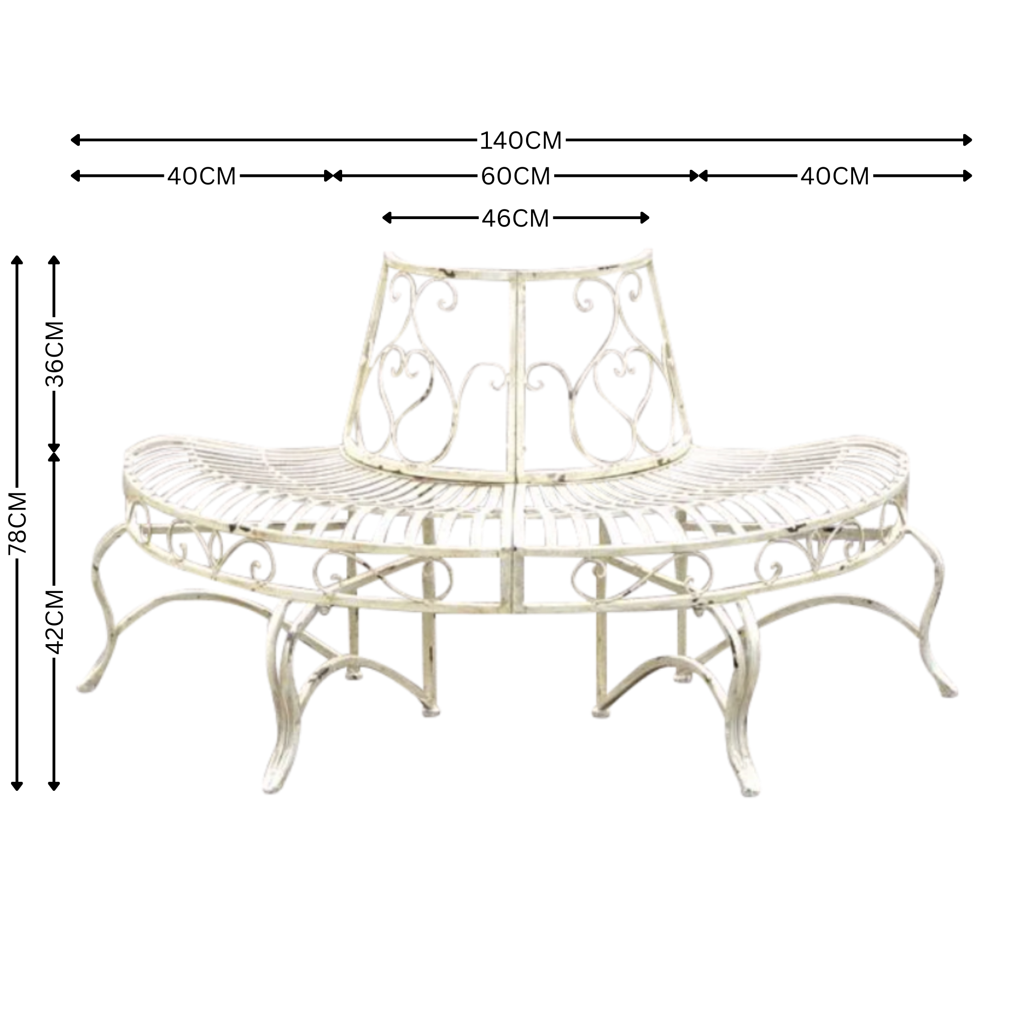Add some elegance and classic charm with this beautiful half tree surround. This surround is perfect against a wall, or double them to make a complete circle for your beautiful tree. This is a classic piece will suit any outdoor space with a hand distressed antique white finish it will contrast and lift an area. With curved shaped seat for seated comfort, Material, Heavy Gauge Iron