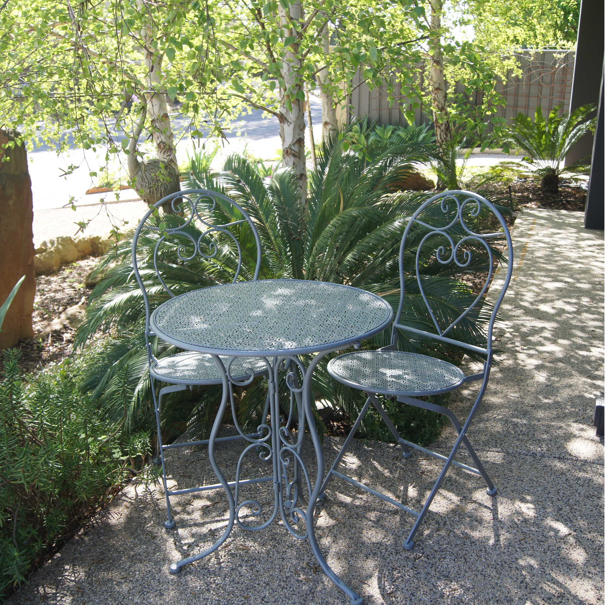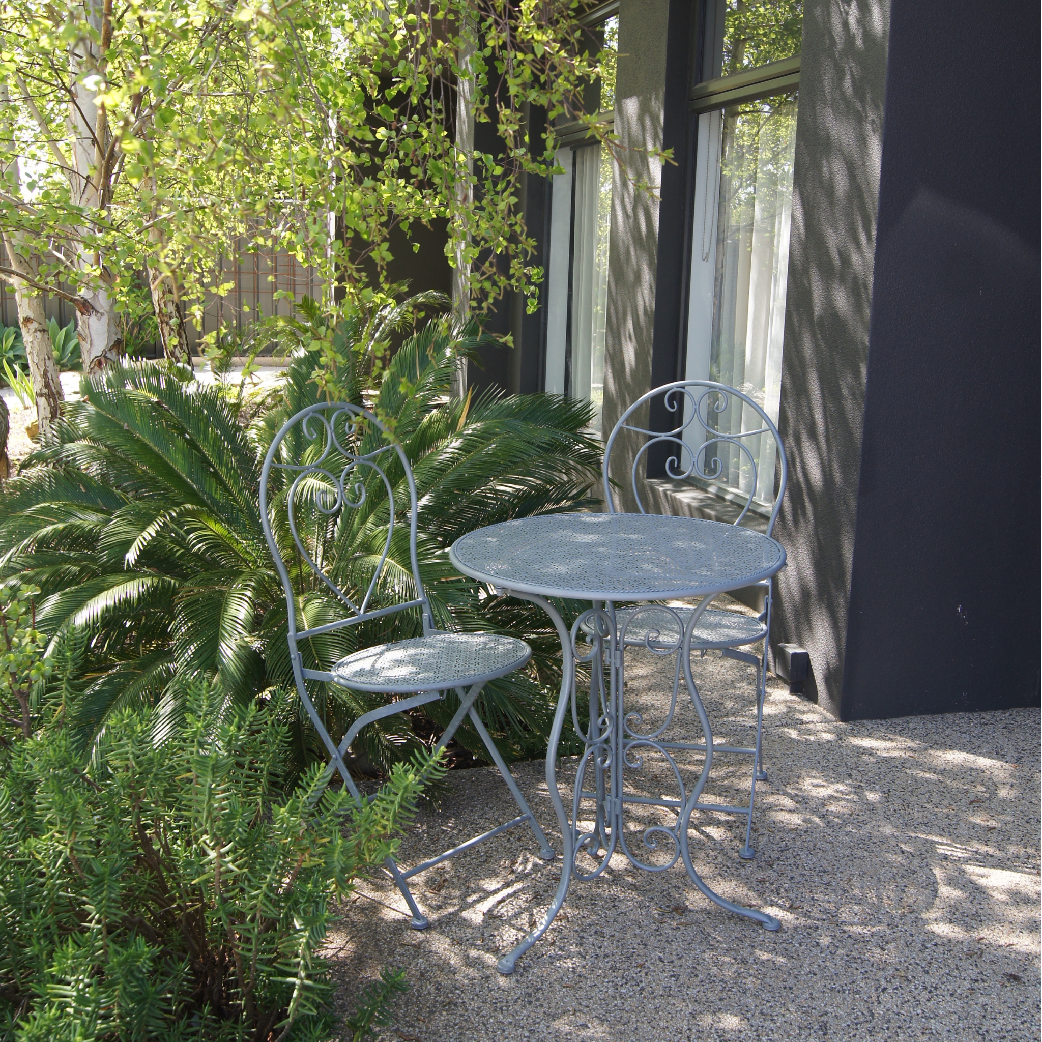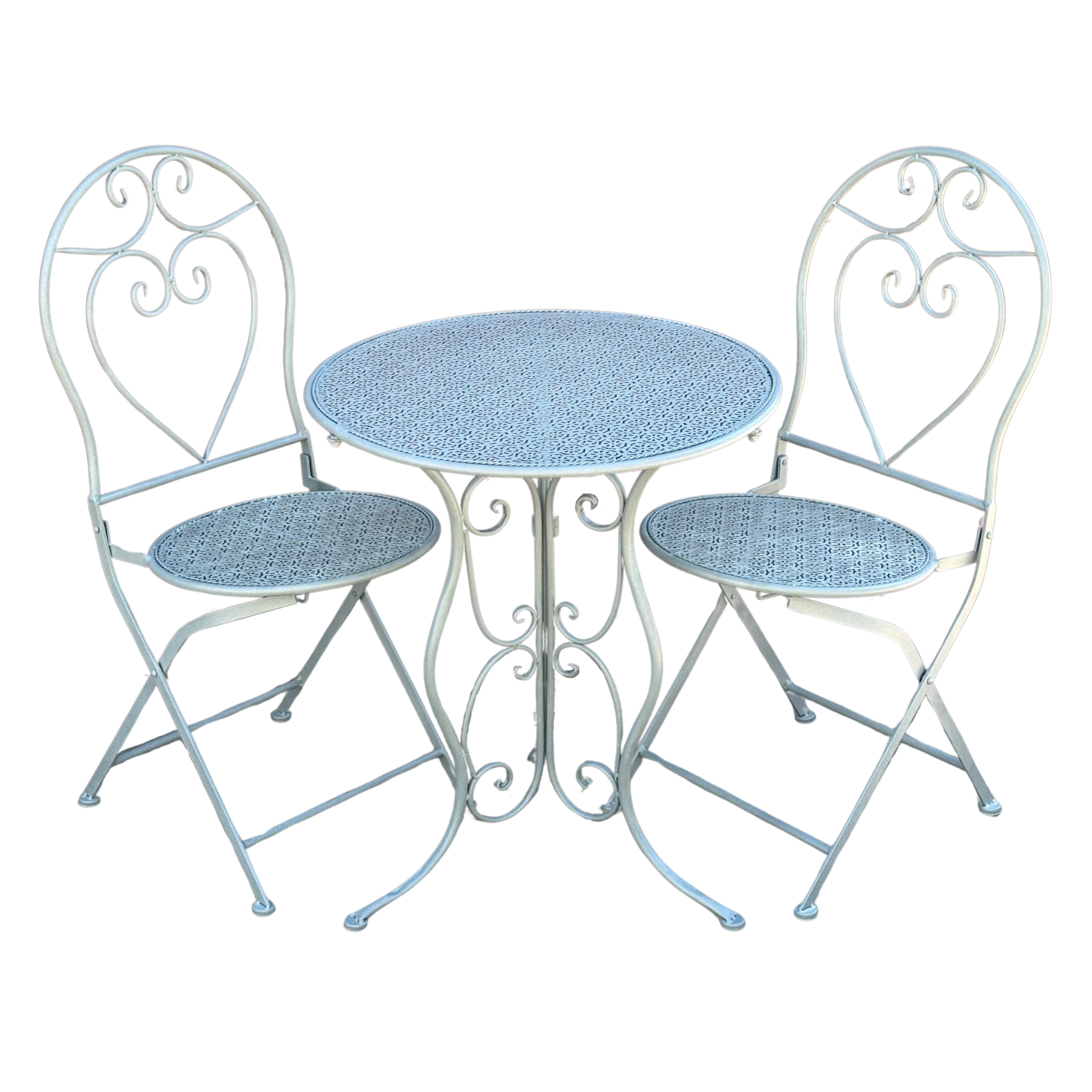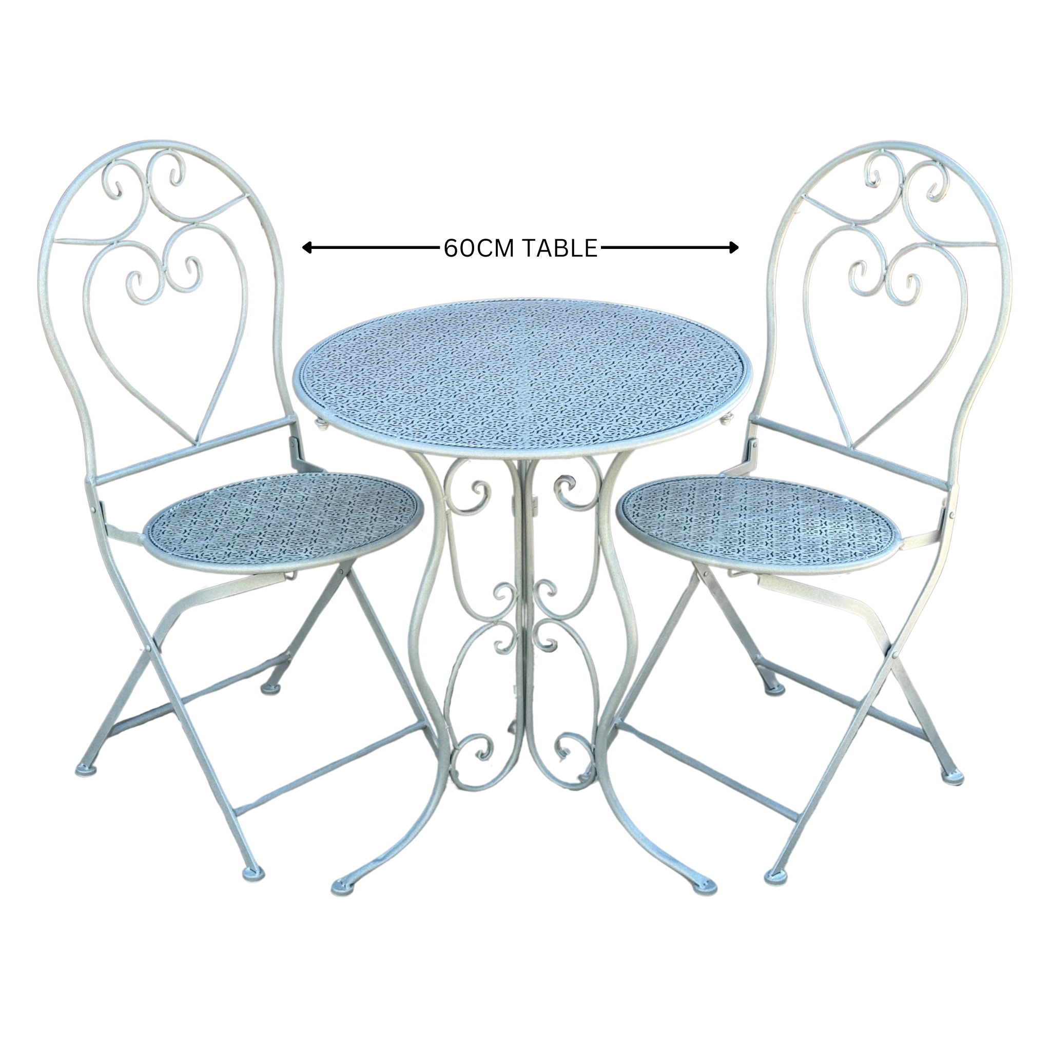3 pce setting, outdoor setting / Patio setting / Veranda setting / Balcony setting. This gorgeous classic setting, will look great on your balcony for your apartment living, in a nook in your garden, veranda or patio. Sit back and take a moment to relax on this beautiful setting classic setting. And the chairs and table fold up for easy storage !! 60cm round table