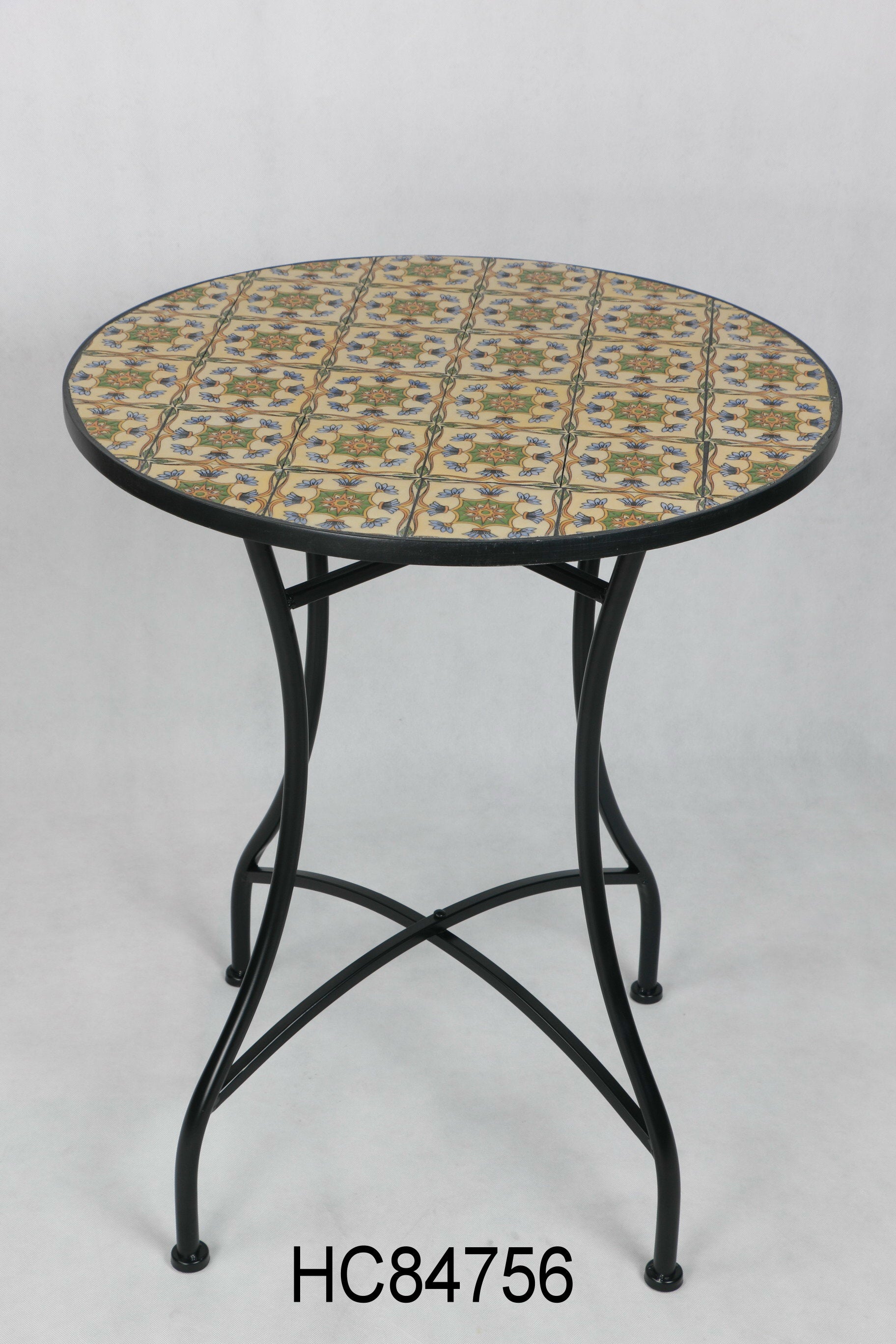 Fashioned from resilient metal with a vibrant ceramic mosaic inlay table top for a striking accent in any outdoor space